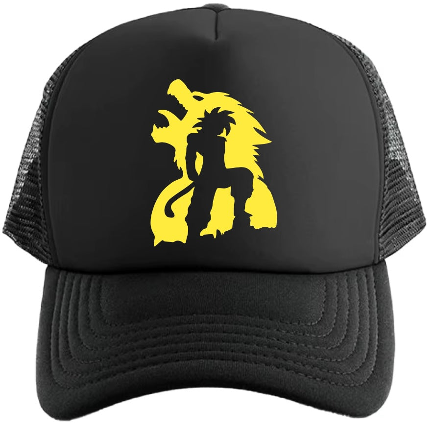 Unleash your inner super saiyan with this stylish black trucker hat. Made with high-quality materials, this hat is both fashionable and functional. Keep the sun out of your eyes while representing your love for Dragon Ball Z. Perfect for any fan or collector.